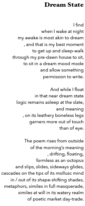 Dream State Share this: Click to share on X (Opens in new window) X Click to share on Facebook (Opens in new window) Facebook Like Loading... September 1, 2019September 1, 2019 by fillière Categories: Being, Creativity, Dream, Poetry, Self, The Searching EyeTags: Alternative, Being, Dream Time, Dream World, Filter, Insight, Poetry, Process, Variables, Variation Leave a comment